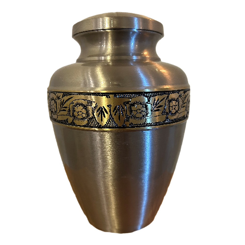 Urne en laiton argent entourée d’un ruban de motifs floraux dorés.