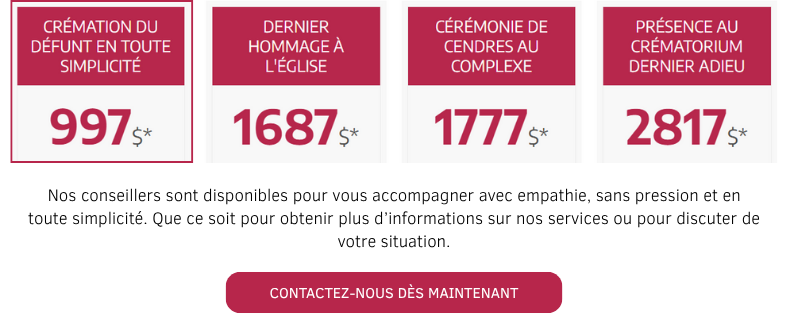 Nous offrons 4 forfaits pour répondre à vos préférences en matière de service de crémation. Le prix d’une crémation est de 997 $ avec notre forfait « crémation du défunt en toute simplicité ». Celui-ci inclut une prise en charge complète du défunt, de la coordination des services à la remise des cendres à la famille à notre complexe en passant par la crémation et le contenant.